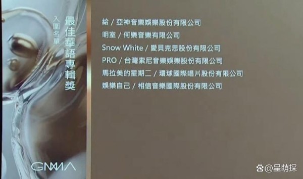 最佳华语专辑:《给》徐佳莹 《明室》洪佩瑜 《snowwhite》JADE 《PRO》 熊仔 《马拉美的星期二》吴青峰 《娱乐自己》 HUSH