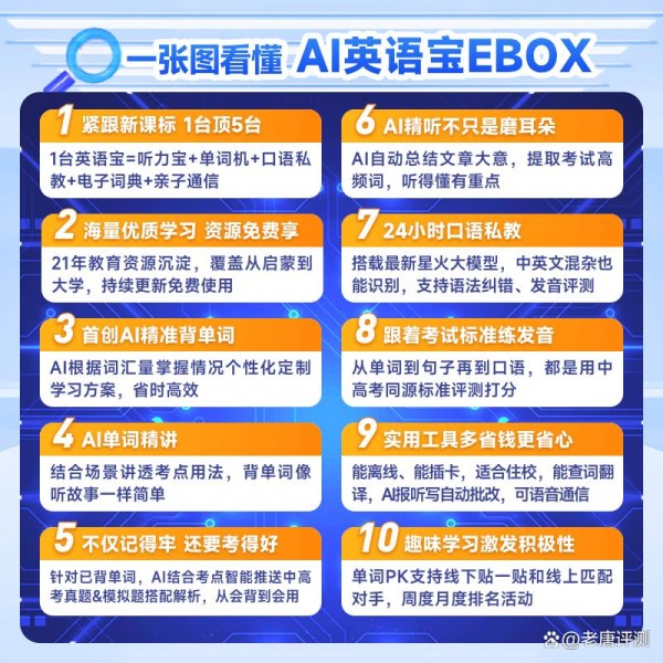 上榜理由:科大讯飞AI英语宝EBOX是它家的“王牌款”,很多家长反馈“AI评测特别准,像孩子发音、语调都能打分,还能给出改进建议,适合想精准提升的孩子”。它的内容很权威,比如同步中高考听力真题,不用额外买资料。有家长提到“以前总怕评测不准确,这款完全改变了我的看法,既专业又实用”,这种“专业+实用”的结合,让它成了追求精准学习或高中以上孩子的优选。