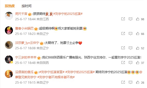 最高点赞量的一条:#刘宇宁巡演官宣# 6月17日,刘宇宁发文官宣“刘宇宁的2025巡演”。