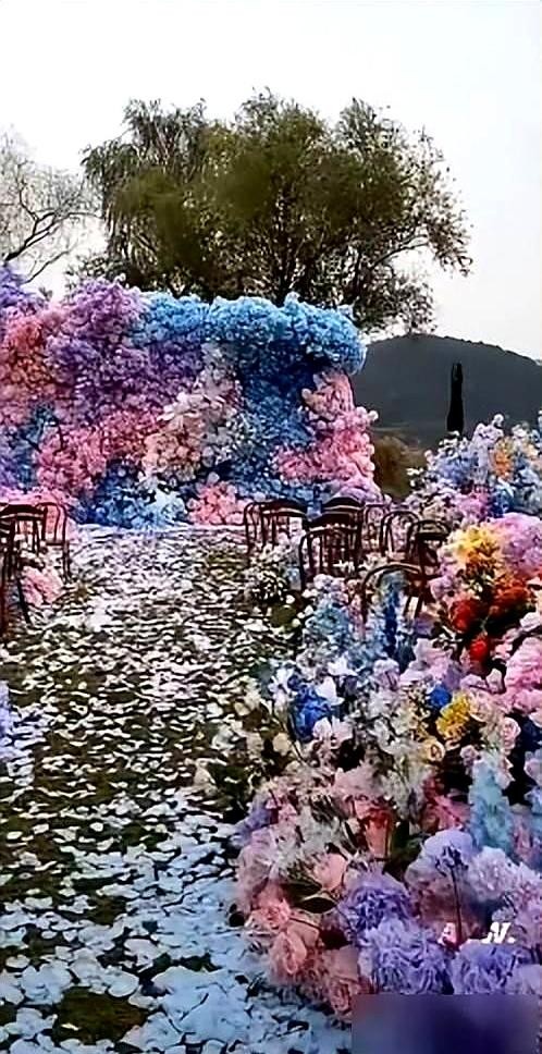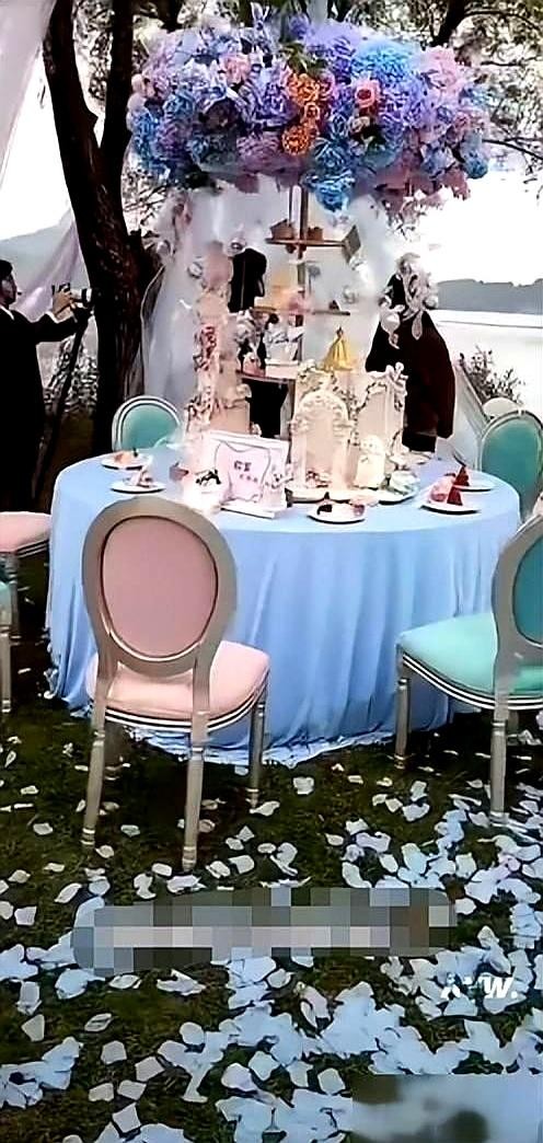 当然,一场婚礼的“槽点”绝不仅限于新人本身。整个婚礼的场面,也处处透露着一股“经费紧张”的气息。地点选在北京的海边草坪,听着挺浪漫,但实际呈现出来的效果却是一言难尽。所有的桌椅都直接摆在草地上,看着就摇摇欲坠,宾客们挤作一团。所谓的“海洋之星”花海主题,背景却杵着几棵与整体风格格格不入的大树,硬是营造出一种“想精致但没装明白”的土气感,活脱脱一个乡镇影楼风的户外派对。