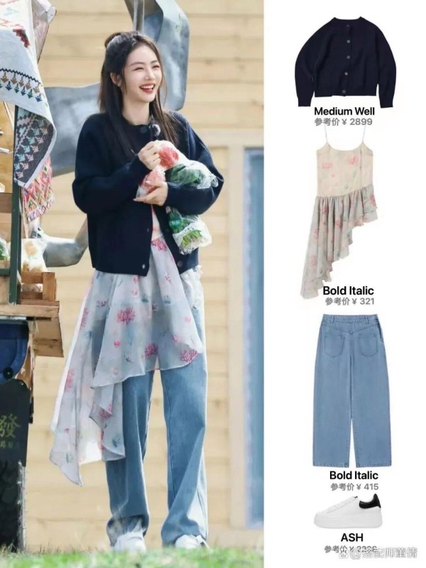 穿搭公式:藏青色针织开衫 + 不规则碎花吊带裙 + 直筒牛仔裤 + 小白鞋