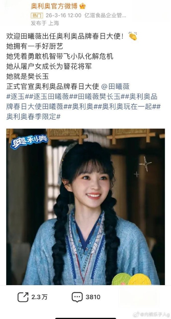 而田曦薇,则被贴上了“个体户”的标签。这个标签意味着什么?没有公开资料显示她拥有传统意义上的强大个人工作室或深度捆绑的单一资本方。她的商业版图显得朴实而“接地气”:2026年3月22日,奥利奥官宣她为品牌春日大使,合作深度绑定她在《逐玉》中饰演的角色樊长玉;4月2日,FILA FUSION官宣她为潮流代言人。资源拼图里,是央视春晚这样的国民舞台,奥利奥这样的快消国民品牌,FILA FUSION这样的运动潮流品牌。这些资源的共同特点是:覆盖面广、亲和力强、大众认知度高。她走的是“由广及深”的路,先铺设广泛的群众基础,再用作品和国民好感度夯实地位。