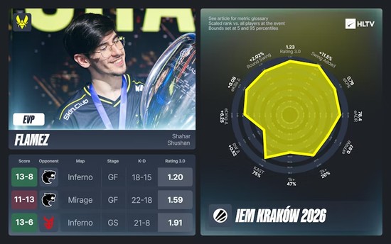 flameZ以1.23总Rating及总决赛1.24 Rating的表现成为Vitality在波兰的第二明星,位列EVP第三。