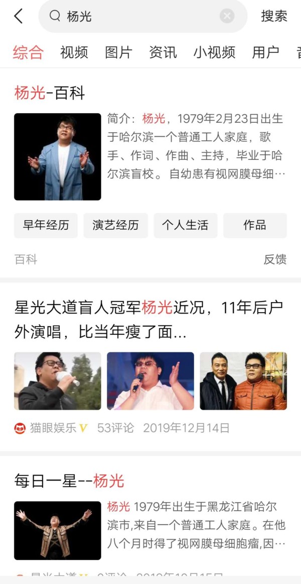 杨光虽然膨胀过,但能在名利场中及时改过自新,仍然是值得原谅的,有感兴趣的朋友,在今日头条app上方的搜索框输入“杨光”,就可以了解盲人歌手杨光的现状了!#搜索Plus计划第四期##头条娱乐指南#