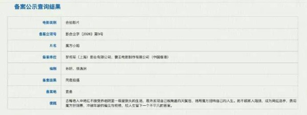 据国家电影局关于2026年3月上全国电影剧本(梗概)备案、立项公示的通知,《魔方小姐》立项,编剧为孙妍、徐逸洲。影片由文牧野监制,白雪(《过春天》)执导,杨紫琼、刘昊然领衔主演,电影目前已杀青。