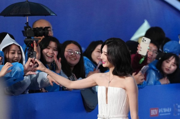4月16日,演员江疏影在开幕红毯上与影迷互动。 新华社记者 鞠焕宗 摄