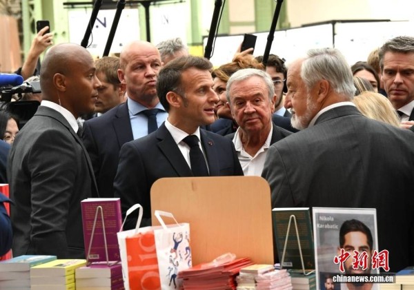 当地时间4月17日,2026年巴黎图书节在巴黎大皇宫揭幕。图为法国总统马克龙在图书节现场参观。中新社记者 李洋 摄