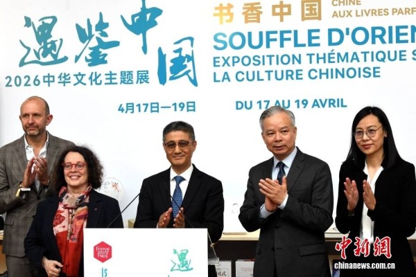 当地时间4月17日,“遇鉴中国”中华文化主题展亮相2026年巴黎图书节。中国外文局总编辑高岸明、前法国驻华大使白林、中国驻法国大使馆公使陈力等出席展览开幕式。中新社记者 李洋 摄