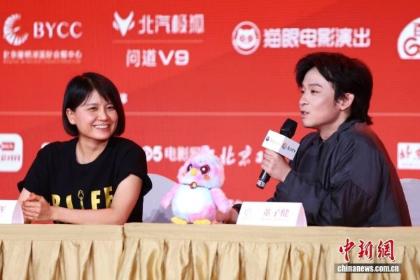 4月18日,第十六届北京国际电影节评委媒体见面会在北京东坝·郎园Station举行,项目创投终审评委会出席。图为评委董子健(右)回答记者提问。中新社记者 王紫儒 摄