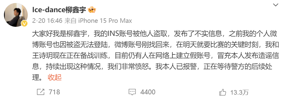 其在微博宣传账号被盗,并且已报警,目前微博尚未更新。