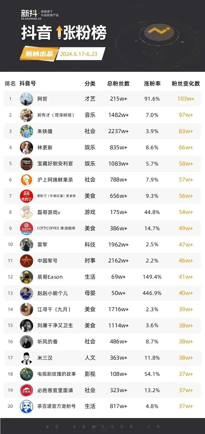 新榜发布的抖音涨粉周榜显示,郭有才正式回归后的一周内,涨粉速度依旧惊人,6月17日到6月23日,郭有才涨粉超97万。