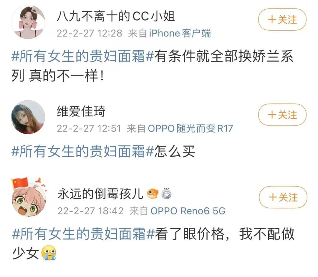 娇兰“第五代御庭兰花面霜”的新品营销,就巧妙地借势了李佳琦在购物节的影响力。3.8妇女节前夕,品牌通过微博话题#所有女生的贵妇面霜#抢占节日流量,由此与其背后庞大的女性粉丝形成对话。