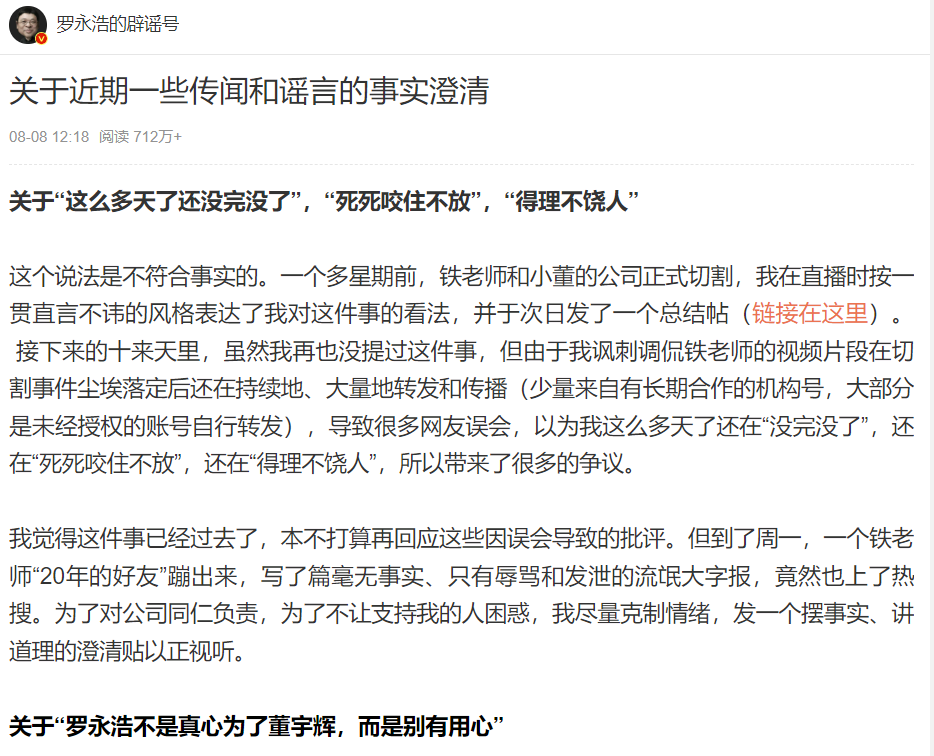 8月8日,老罗洋洋洒洒5000字,回击俞敏洪好友“五宗罪”指责。不仅如此,他还列举了新东方过往的负面事件,直言“俞敏洪的支持者不要再激怒我,否则将公开更多猛料。”