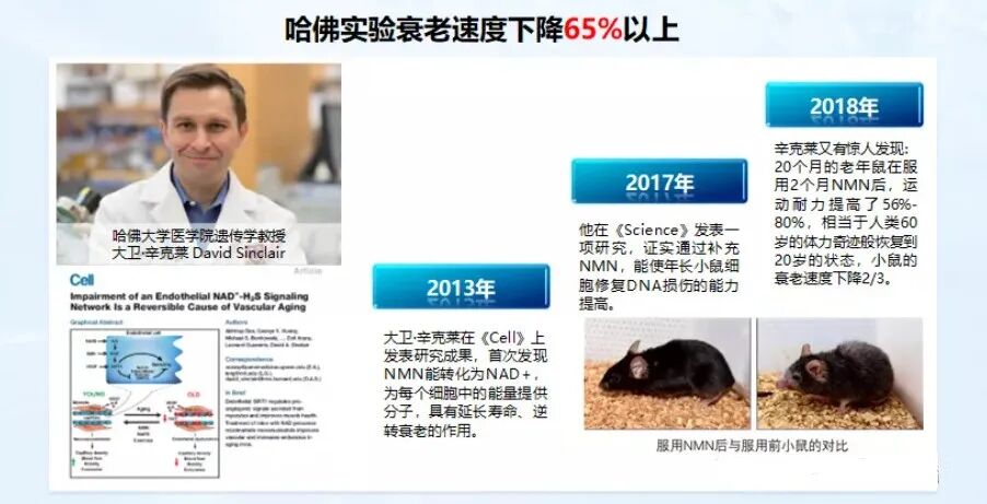 一直以来,科学家对于生命的探索研究在不断的更新迭代,2013年12月,哈佛大学遗传学教授David Sinclair(大卫 • 辛格莱尔)在全球顶级学术期刊《Cell》上发表“用NAD补充剂提升NAD一周后,小白鼠的寿命延长了30%”的研究成果,首次公开NAD+补充剂可显著逆转衰老、延长寿命,此项研究轰动世界,开启了NAD补充剂抗衰老物质的成名之路。