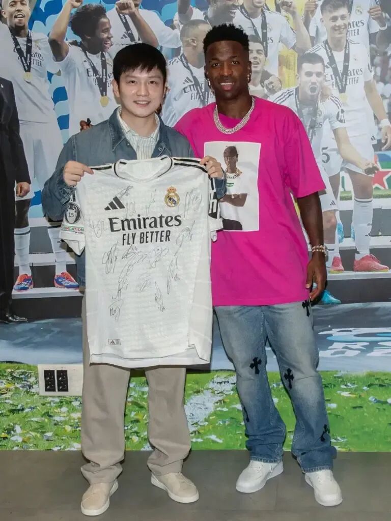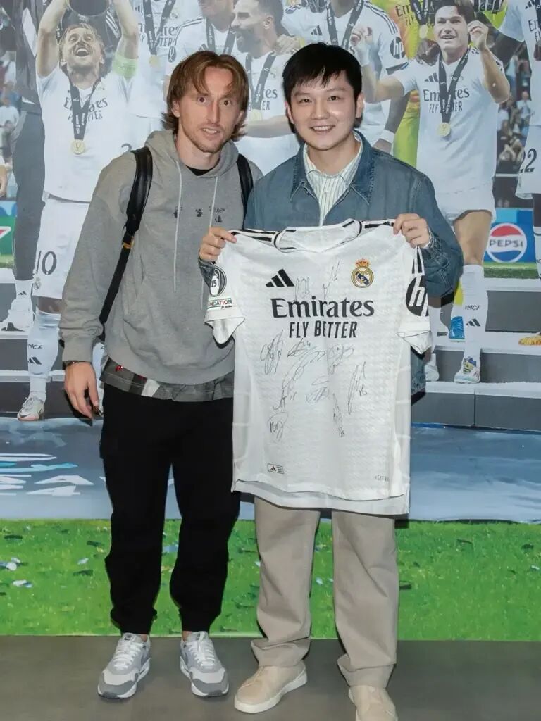 在照片中,樊振东身穿时尚便装,面带笑容地造访了皇马俱乐部。他举起一件写有多个签名的皇马球衣,与俱乐部高层弗洛伦蒂诺、布特拉格诺,以及球队核心球员莫德里奇、贝林厄姆、姆巴佩和威尼修斯等人亲密合影。这些照片不仅展现了樊振东的个人魅力,也体现了他与皇马的深厚情谊。