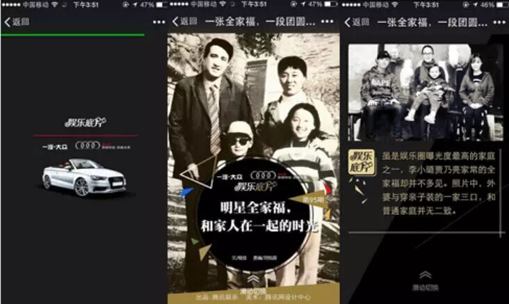 2015年春节遇上情人节,腾讯视频上演奥迪《明星全家福》+加多宝《明星新春送祝福》+康师傅《加你加年味》营销三重奏——从黄晓明、范冰冰甜蜜感爆棚的全家福,到李冰冰、海清等明星新年祝福,再到黄磊、李易峰主演的小剧——全方位立体情感倾入,品牌聪明、及时地潜入了用户的内心。