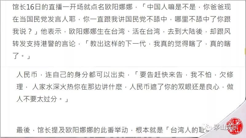 后来,在8月中旬时,欧阳娜娜转发了一条人民日报的微博后,再一次“伤到了”一小撮人台湾网友的玻璃心。这其中就有一位素来以在直播间“攻击”大陆而在台湾出名的“知名”网红馆长陈之汉。当时这位知名网红在自己的直播间里大肆“怒斥”欧阳娜娜,说欧阳娜娜是“台湾人的耻辱”,还说什么“教出这样的下一代,我真的觉得瞎了,真的瞎了。”最后,他还扬言“要告赶快来告,我不怕。”