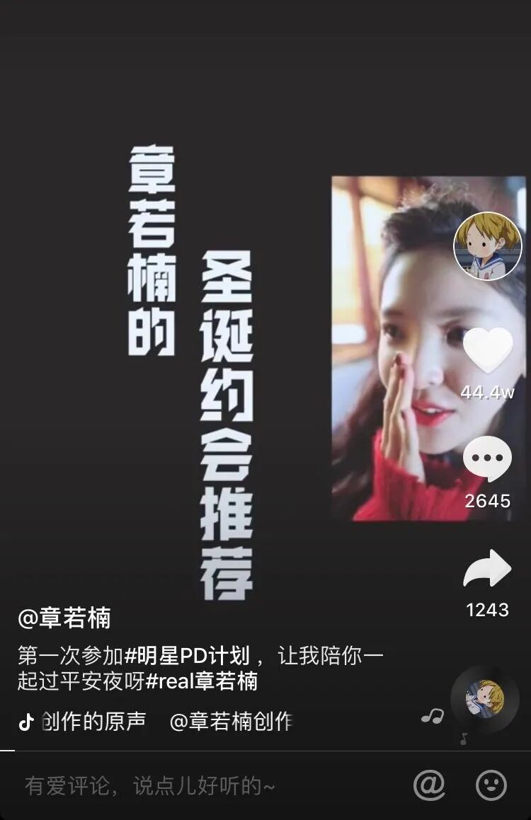 章若楠是最早响应抖音明星化的演员之一,2018年她的一则平安夜探店视频获得44万点赞,平易近人的视频风格,配上“让我陪你过圣诞”的文案,评论区纷纷留言:小姐姐好甜,咖啡我也想喝一口”。凭借这条视频,章若楠抖粉破百万。