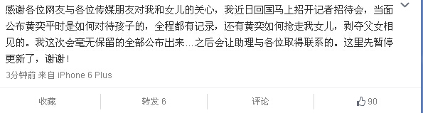黄毅清似乎听到了呼唤,刚刚在中午发了一条微博,号称将“暂停更新”,说是准备开记者会,“当面公布黄奕平时是如何对待孩子的,全程都有记录,还有黄奕如何抢走我女儿,剥夺父女相见的……”