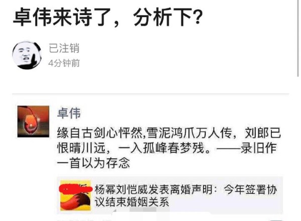 12月22日,杨幂跟刘恺威宣布离婚消息引来诸多讨论,这个时候怎么能少了娱乐圈第一狗仔卓伟,话说卓伟真的是非常有前瞻性的狗仔,有些还不确定的传闻卓伟都能说对,最先曝光杨幂和刘恺威已经离婚的就是卓伟团队了。而卓伟也非常有才华,平时喜欢写诗,经常会在朋友圈写诗回应明星的爆料和回应,在杨幂和刘恺威红布离婚消息后,卓伟在朋友圈写了一首作为回应关于杨幂刘恺威为何离婚的诗。